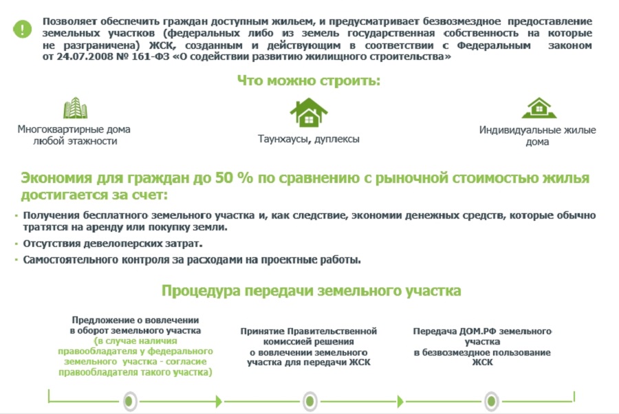 - Бесплатного участка под строительство, который безвозмездно предоставляет ДОМ.РФ. А как известно, стоимость земли составляет значительную часть от затрат девелопера. Особенно, в мегаполисах.