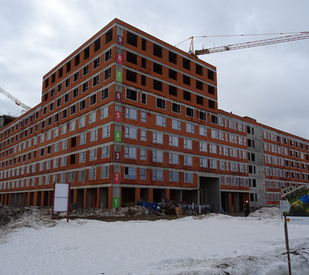 На данный момент (апрель 2018 г.) первый дом практически готов, и скорее всего, будет введен в эксплуатацию к концу 2018 г. Здесь надо отметить значительно увеличившееся количество квартир: от предусмотренных 483 до утвержденных впоследствии 562 шт.