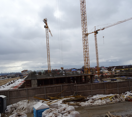 В доме №2 (блок В) ситуация менее вдохновляющая — на 100% возведен только первый этаж 4-й секции. Ведутся работы над вертикальными конструкциями 2-го этажа. В секциях №5-10 (блоки А, Г, Д, Е) монолитные работы на уровне цокольного/первого этажа завершены на 50–100%.