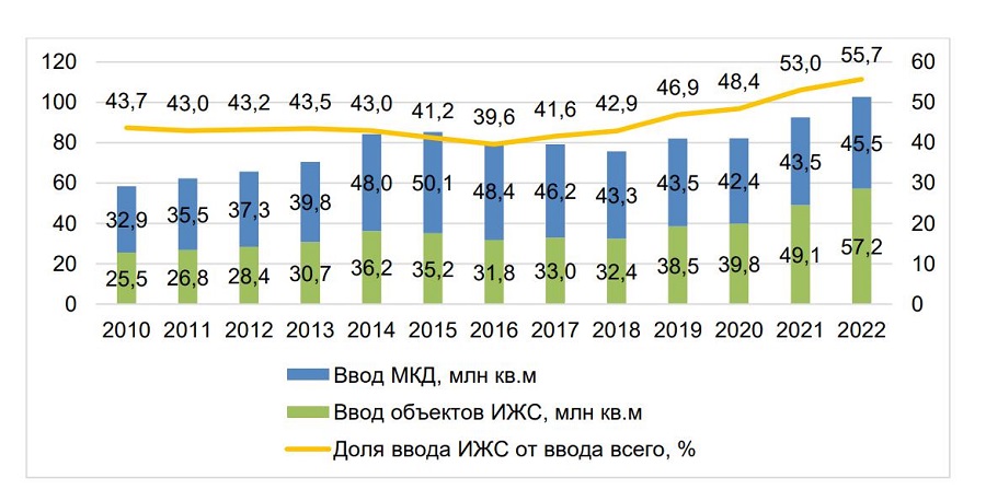 Объем ввода объектов ИЖС и МКД в России, млн кв. м общей площади