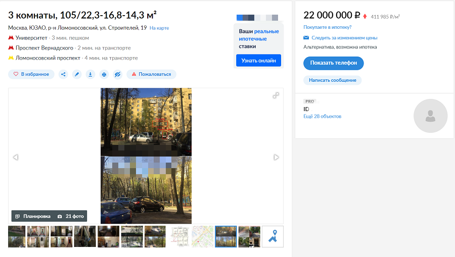 «Продаются 3 комнаты в четырехкомнатной квартире. Коммуналка. ЮЗАО. Район: Ломоносовский, Университет (300 метров от метро). Общая площадь: 105 кв. м; жилая: 73,4 кв. м. Комнаты к продаже: 22,3/16,8/14,3 кв. м, 4-ая комната 19 кв. м. Все комнаты изолированные. Кухня: 9 кв. м. Два балкона. Один выходит во двор, второй на ул. Строителей. Балконы находятся в комнатах, которые мы продаем. С/У раздельный. Во дворе большая детская площадка, скверик, огороженная площадка для выгула собак. Чистый подъезд, приличные соседи. Во дворе установлены шлагбаумы. Двор закрыт для проезда и парковки чужих автомашин. В нашем доме такие квартиры с ремонтом стоят более 45 млн. руб. На данный момент в нашем доме выставлены на продажу две 4-х комнатные квартиры одна за 49 млн. руб., вторая за 53 млн. рублей. Я собственник данных комнат. Комнаты в собственности более 10-ти лет (первичная приватизация)», - отмечает продавец.