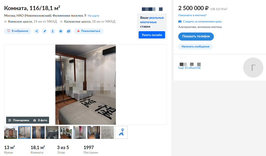 «Продается комната в 4-х комнатной квартире. Остальные комнаты принадлежат городу. В 2-х комнатах живут два человека, мужчина и женщина, в третьей комнате никто не живет. Московская прописка, прекрасная инфраструктура. Рядом Калужское шоссе, МКАД, престижный Ленинcкий проспект, Киевское шоссе, ведущее прямо в аэропорт Внуковo (10 мин на автобусе). До метро Юго-Западная -15 минут. До метро Саларьево - 10 минут. Скоро открытие станции метро в Московском. Рядом школы, фитнес-центры, рестораны, медцентры, при этом чистый незагазованный воздух. Огромный шкаф-купе, диван, люстра-все остаётся новым жильцам. Отдельная кладовка в личное пользование. Находится в собственности. В квартире две ванных и два санузла. Это коммунальная квартира для учителей. Все жильцы интеллигентные люди, работающие в сфере образования. Все документы в идеальном состоянии», - отмечает продавец.