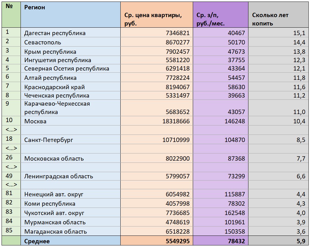Нынче «кусающаяся» ипотека побудила «Мир квартир» выяснить, за сколько лет в каких регионах можно накопить на вторичную квартиру, если откладывать зарплату целиком. В своем исследовании портал руководствовался данными Росстата по средним зарплатам на февраль этого года и ценами на «вторичке» из собственной базы.